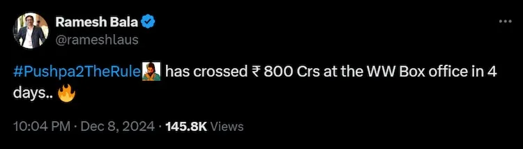 Trade analyst Ramesh Bala, on his X page, mentioned that Pushpa 2 has crossed Rs 800 crore gross at the box office worldwide in its opening weekend. This is a phenomenal milestone for Pushpa 2 as the film received mixed reviews from the critics.